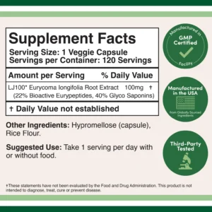 Tongkat Ali, also known as Eurycoma Longifolia Jack, Malaysian Ginseng, or Longjack, is an herb which has been found to support healthy libido and cortisol levels. Our product is an extract of the eurycomamones, which is the chemical compound responsible for Tongkat’s effects. This allows for a much smaller dose to be necessary than if one was to try and get the same eurycomamone through ingesting the herb itself. The LJ100 Extract is one of the most potent and well researched Tongkat Ali Extracts on the market and is standardized to 22% bioactive Eurypeptides and 40% glycosaponins. This is much more potent than the average Tongkat Extract so a much lower dose is needed.