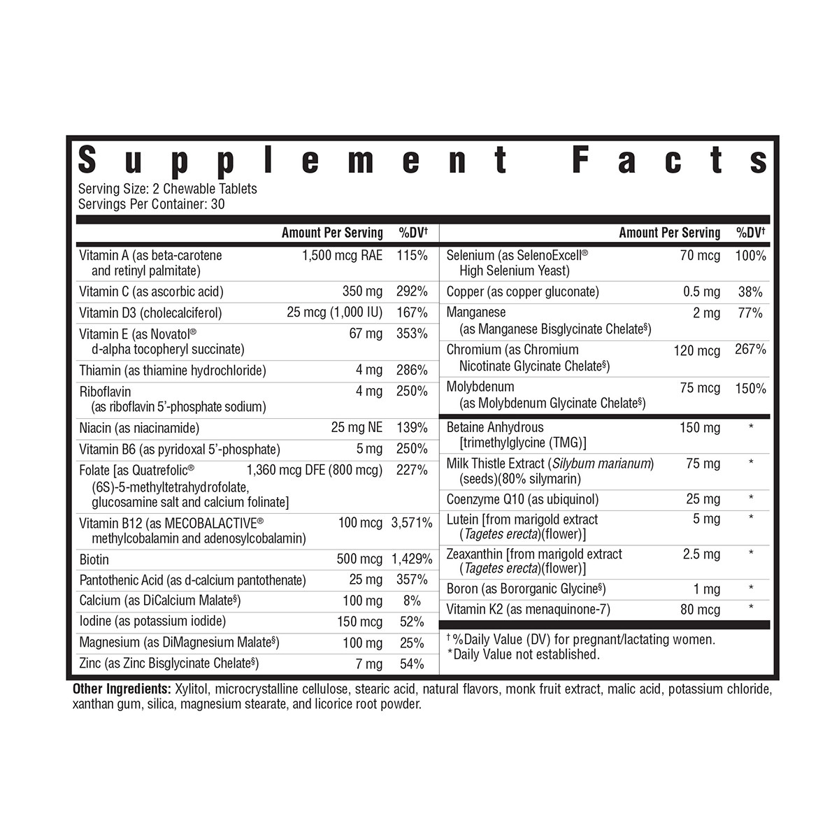Vitamin A is included in two forms: beta-carotene and retinyl palmitate, to help support those who have trouble converting “provitamin A” compounds (such as beta-carotene) into the active retinyl/retinol forms. Vitamin C and coenzyme Q10 provide antioxidant support, supporting a healthy immune system and cellular integrity. Trace minerals are included in their chelated forms, as amino acid-chelated minerals are typically well-absorbed and may be more easily tolerated than alternative supplemental forms. Betaine Anhydrous (TMG) is also added for additional methylation support.*