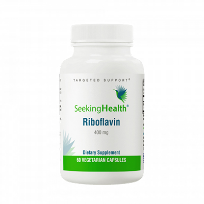Riboflavin by Seeking Health provides 400 mg of riboflavin, also known as vitamin B2, per vegetarian capsule. Riboflavin is important for healthy growth and development and normal red blood cell production. It also assists in the process of releasing energy from carbohydrates. Riboflavin is a water-soluble B vitamin that must be replenished by dietary sources daily in order to maintain adequate levels to support normal function and health. Coenzyme forms of riboflavin are required for conversion of tryptophan to niacin and of B6 to its coenzyme form (P-5-P). Riboflavin may help support healthy mitochondrial function. It also may help to maintain healthy homocysteine levels. Riboflavin can be found in foods such as milk, meat, eggs, nuts, enriched flour, and green vegetables. Although deficiency is not common in the United States, it may be necessary for certain individuals to use supplements to obtain adequate daily intake of this important nutrient.*